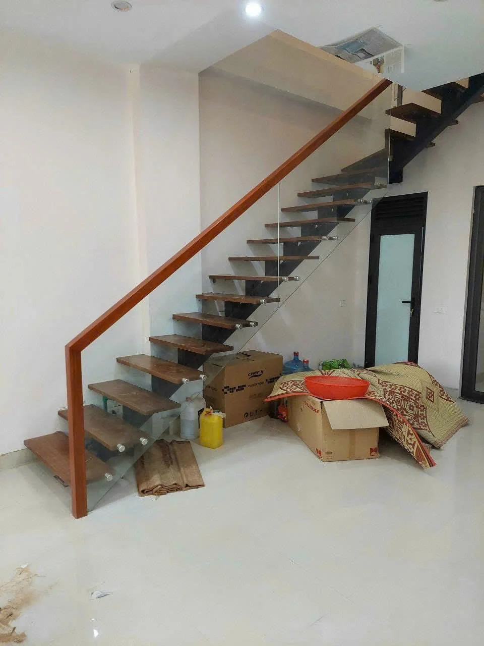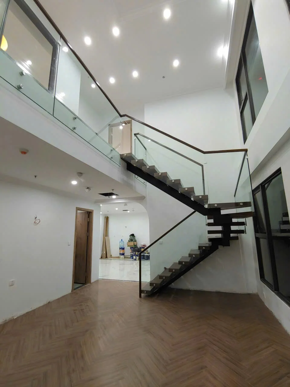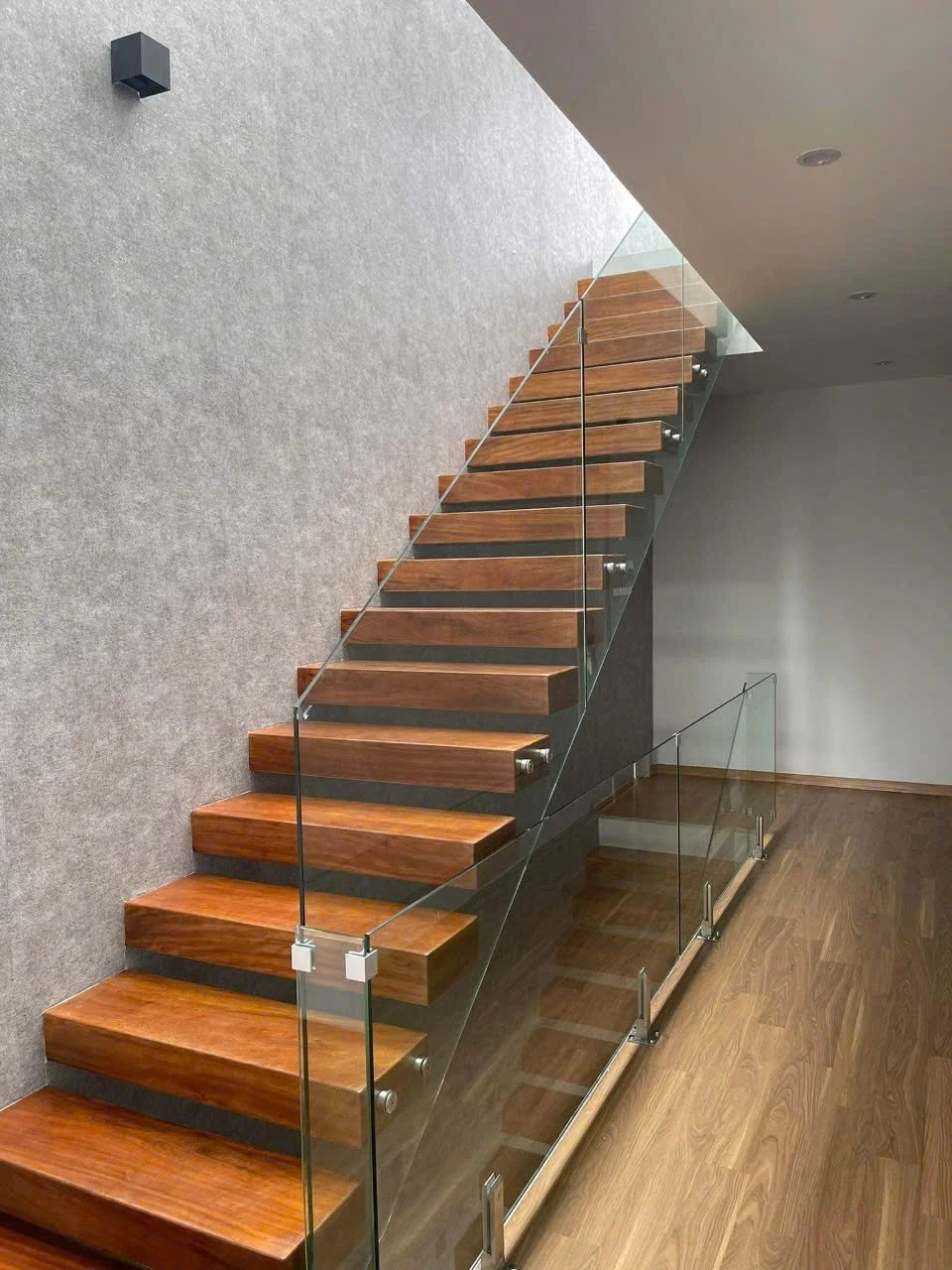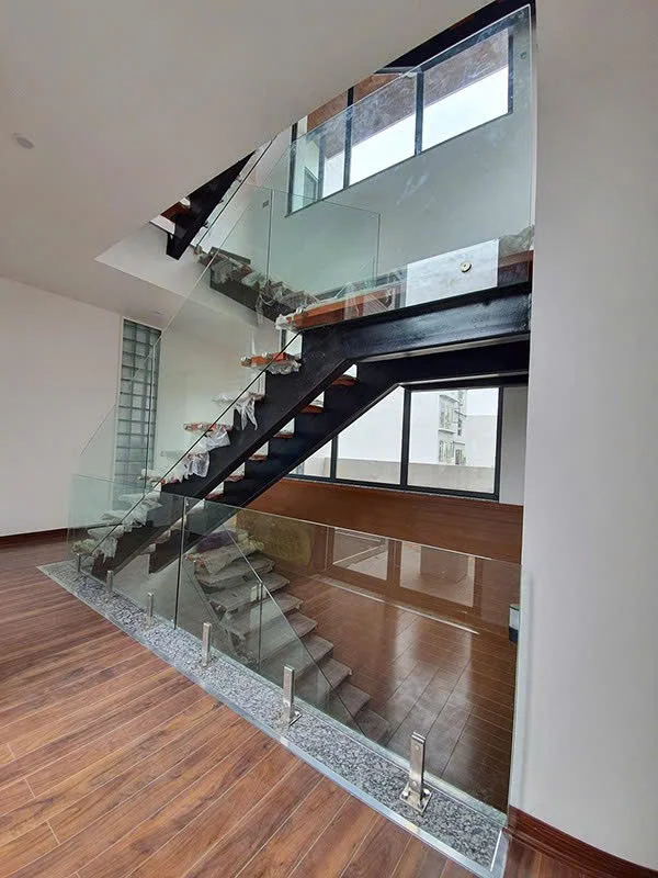 Lan can là nơi thể hiện rõ nét nhất sự sáng tạo trong thiết kế cầu thang xương cá. Chúng tôi sử dụng kính cường lực dày từ 10mm đến 12mm – an toàn, chắc chắn và mang lại cảm giác thông thoáng cho không gian. Kính trong suốt giúp mở rộng tầm nhìn, đón ánh sáng tự nhiên và làm không gian trở nên hiện đại, tinh tế hơn.